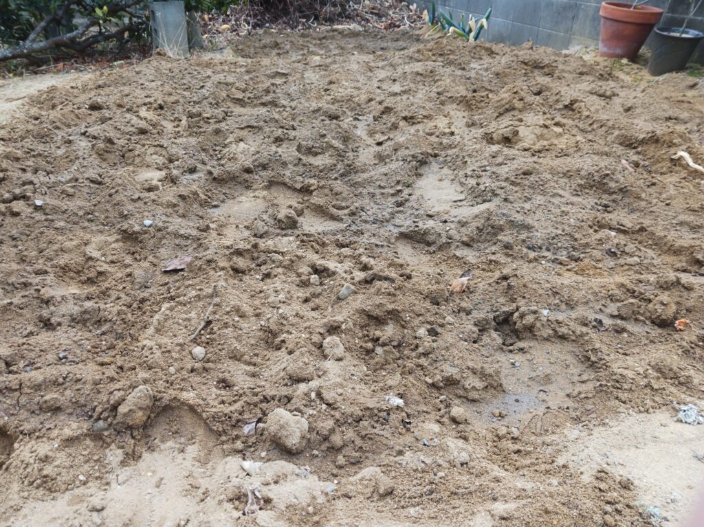 あと問題の畑なんですが、みた感じ、水捌けはいいんですが保水性が足りないと思い赤玉土を混ぜ来んできました。