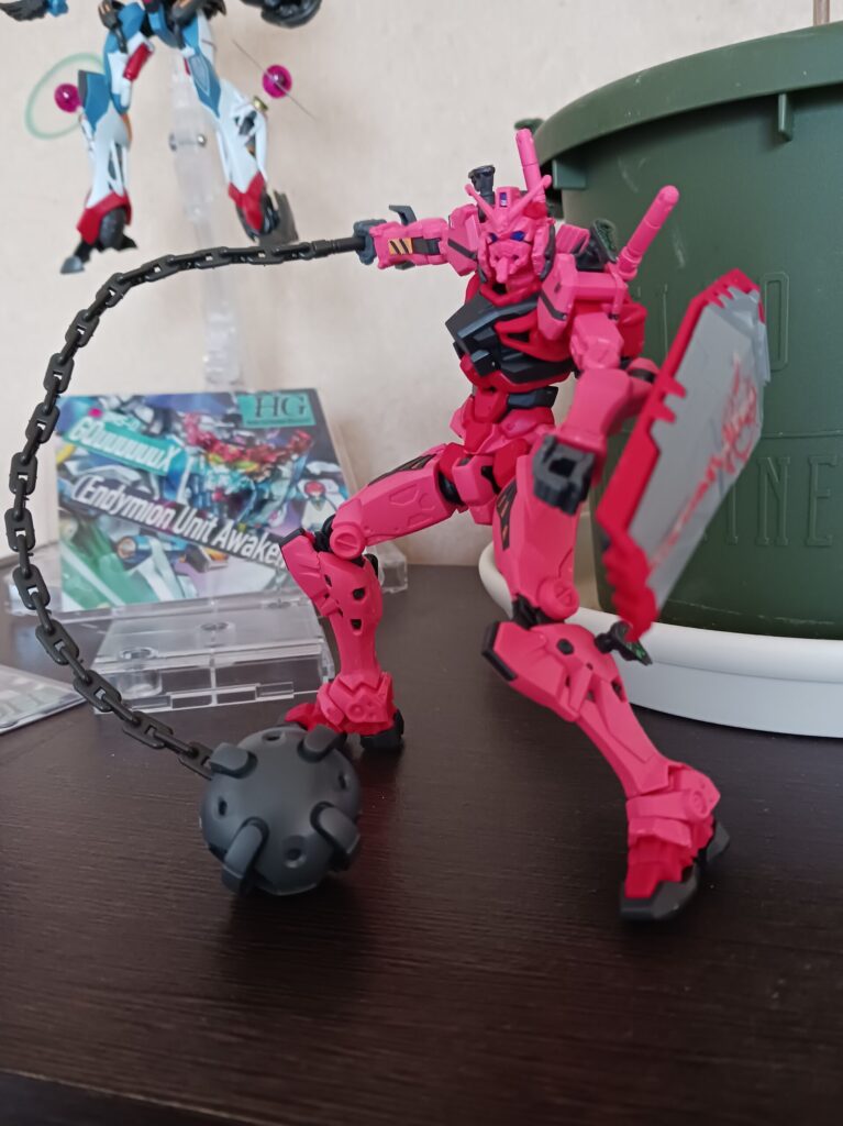 の時に手に入れた赤いガンダムを作りました。最初の最初が頭部のバックモニターなんですかね?にシールを貼る作業で、ここが一番の難関でした笑出鼻から心をへし折りにくるなんてさすが伝説の機体です。そこから先は順調に組み上げていけたんですが、武器のガンダムハンマーの鎖の部分!この細いところの接続部にニッパーの先が入らなくてですね、最終弟が使っていた彫刻刀を引っ張り出してカットしました。切り出し刀ってやつですね。それでも少しボコボコしてるところが気になります。遠巻きに見たら分からないんですけどね。組上がったのはこんな感じ。